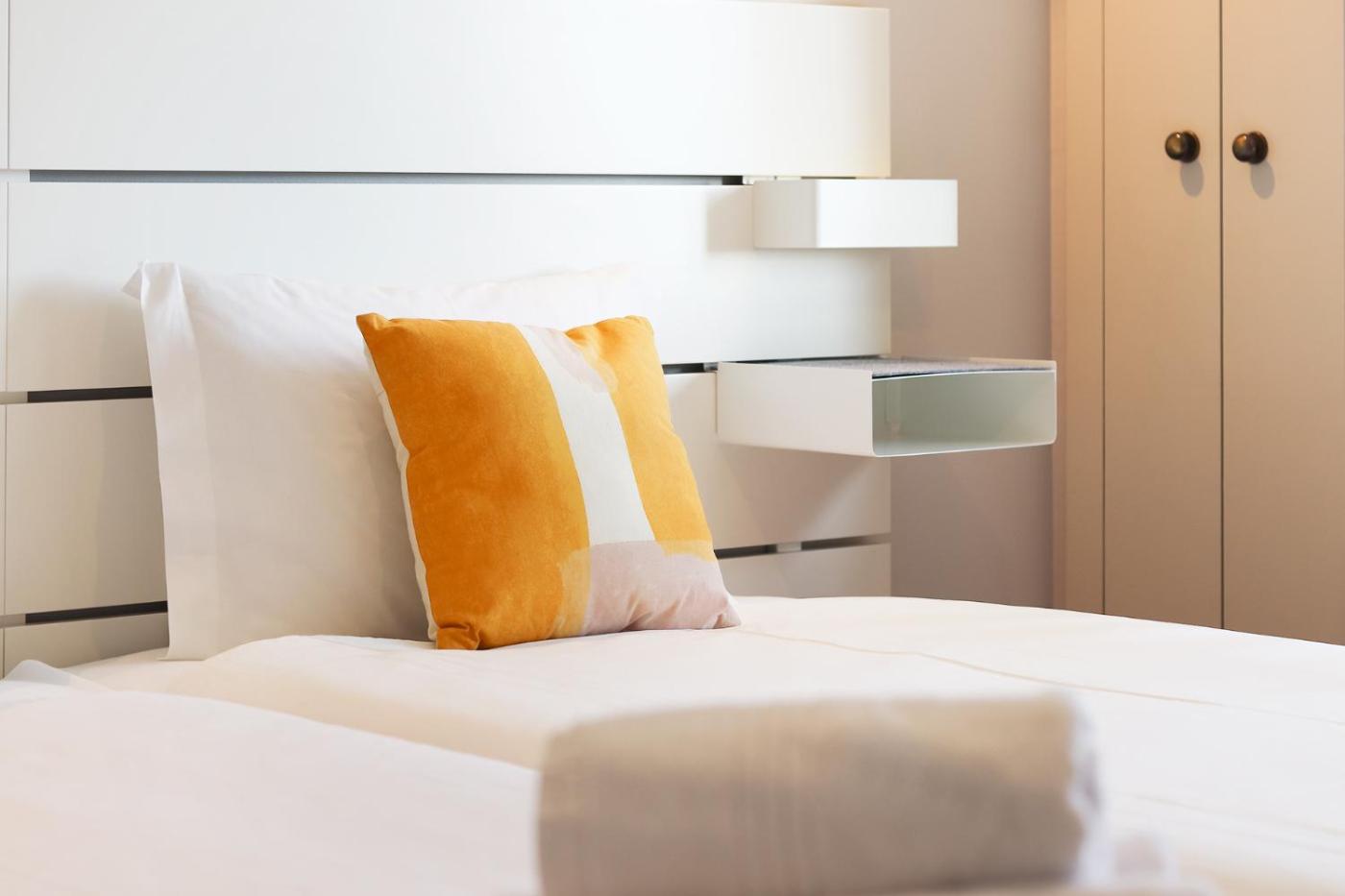 Este apartamento dispõe de 2 quartos, uma cozinha com frigorífico e máquina de lavar louça, e 2 casas de banho com chuveiro, um secador de cabelo e máquina de lavar roupa. Toalhas e roupa de cama são providenciadas neste apartamento.
