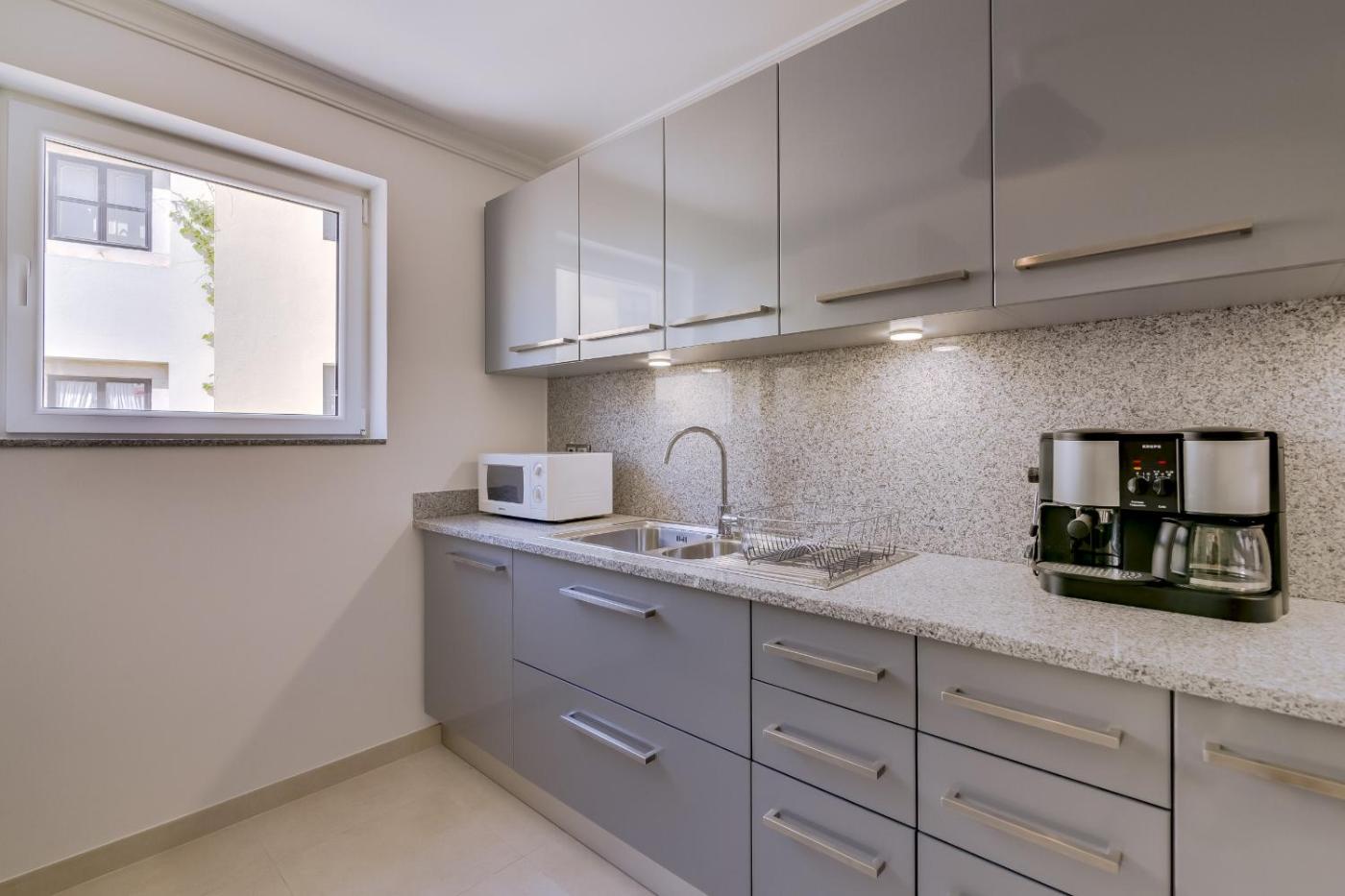 Este apartamento dispõe de uma televisão. A cozinha apresenta um frigorífico, um forno e um micro-ondas, assim como máquina de café e chaleira.